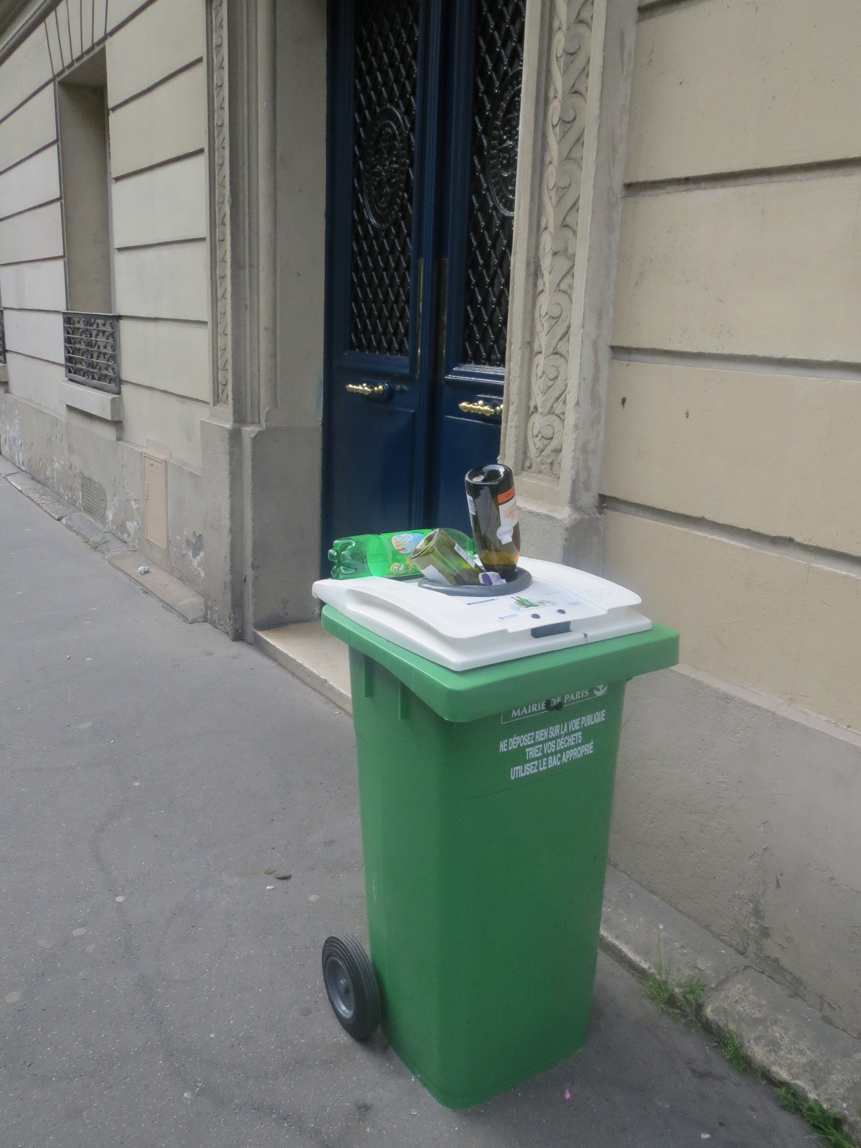 As we were returning down rue des Feuillantines to our apartment, we commented that when the glass recycling barrel that was put out last Wednesday, almost a week ago, finally gets picked up, we’ll no longer recognize which building is ours – the uncollected recycling container has become our landmark!