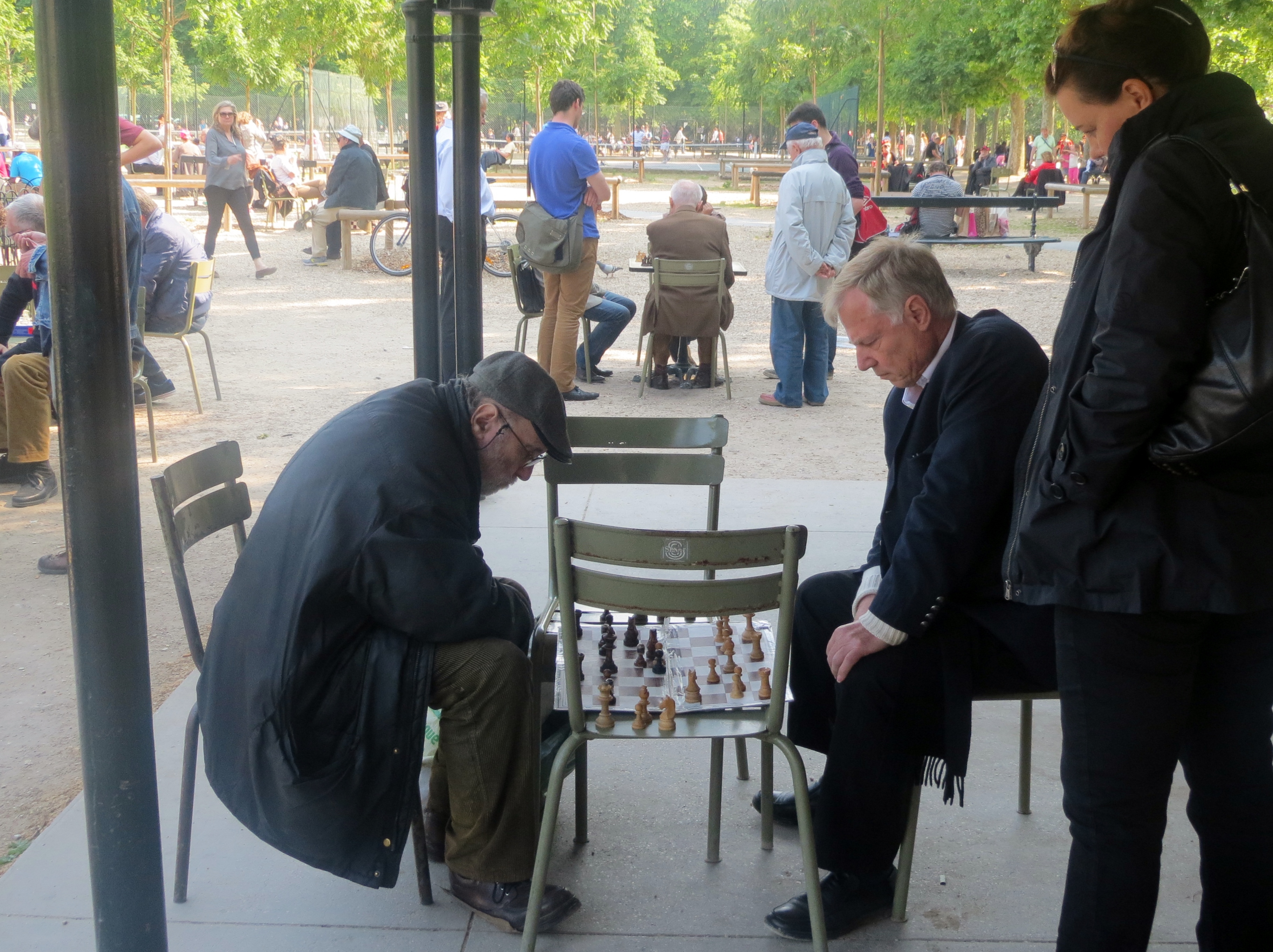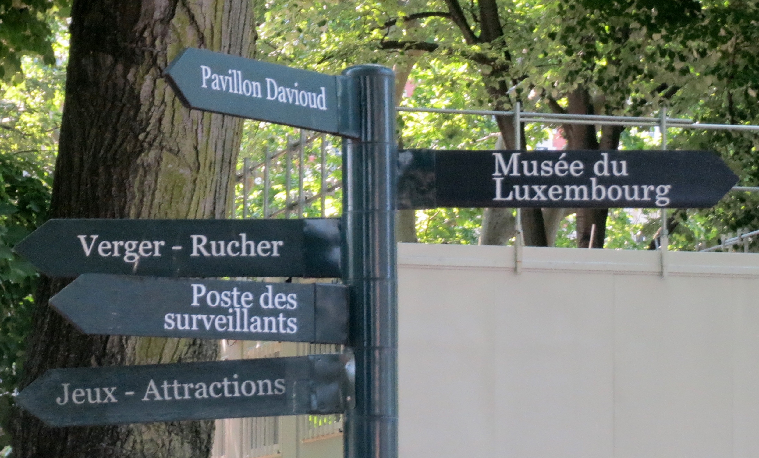 The park is enormous. This is one of the signposts for pedestrians. The pavilion was the site of chess playing. The jeux-attractions included a large complex of sandboxes and a small carousel for children. The verger and rucher — vineyard and beehives — were, I guess, for those who wished to imagine themselves far out in the country in this Parisian garden.