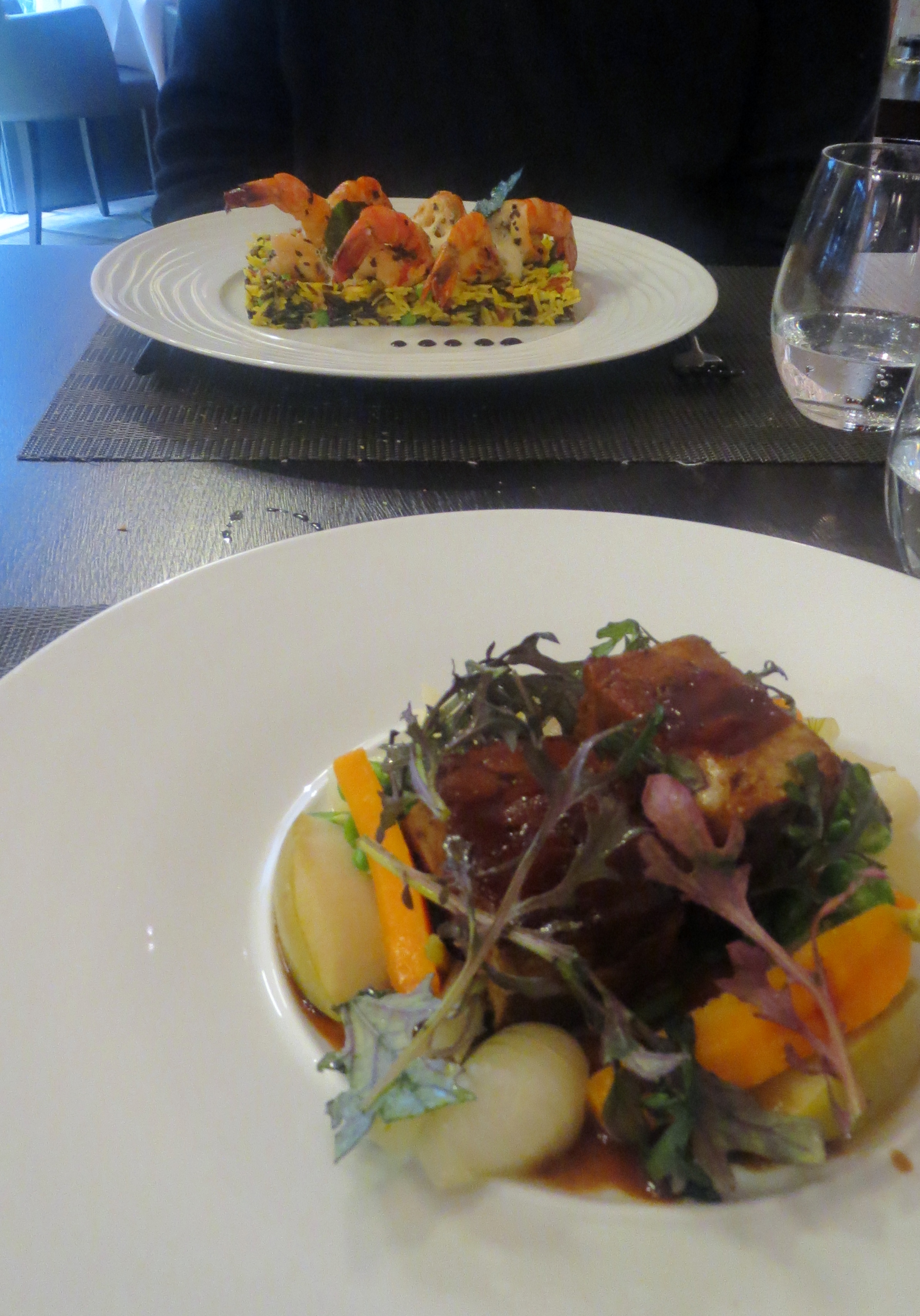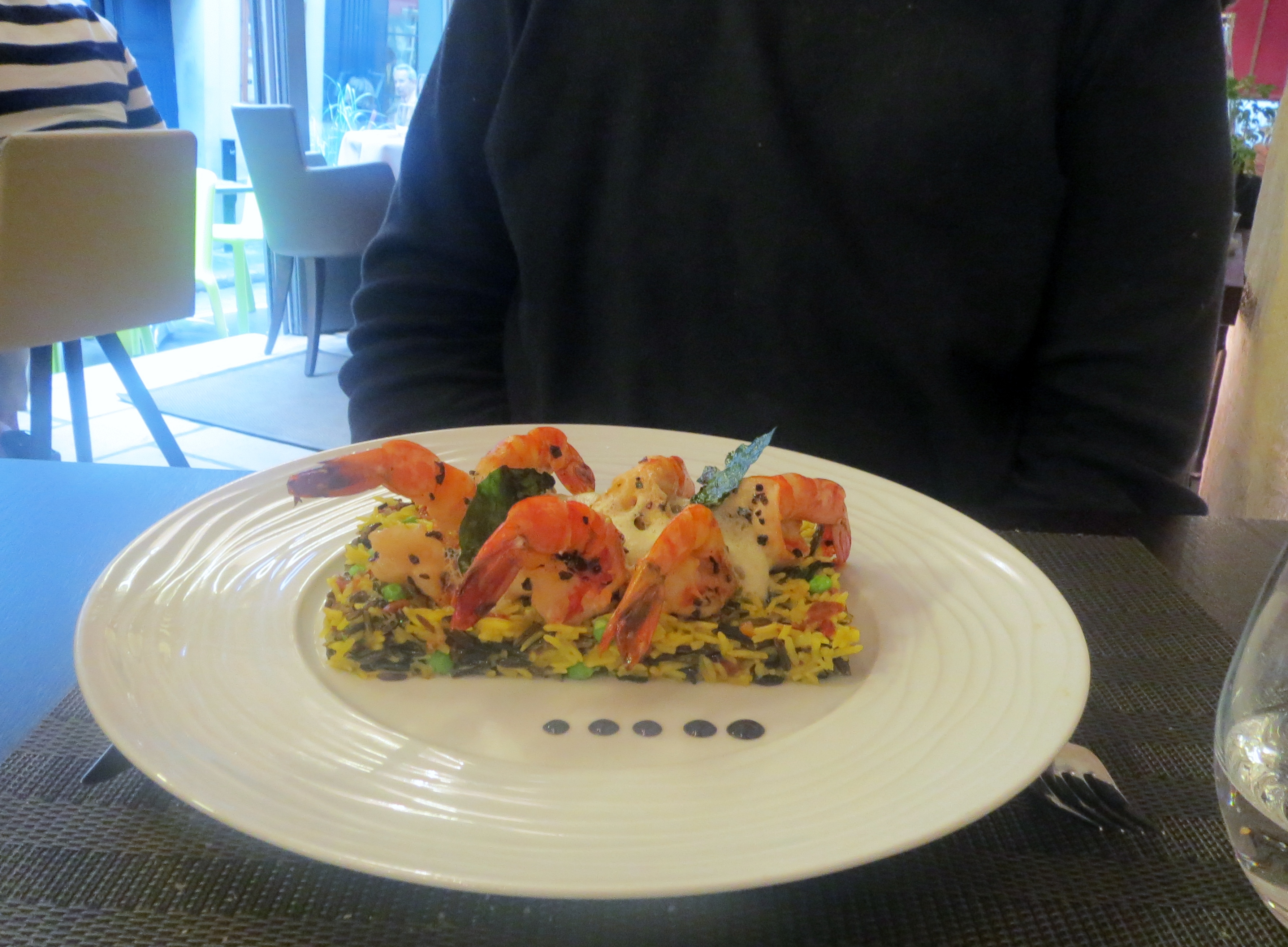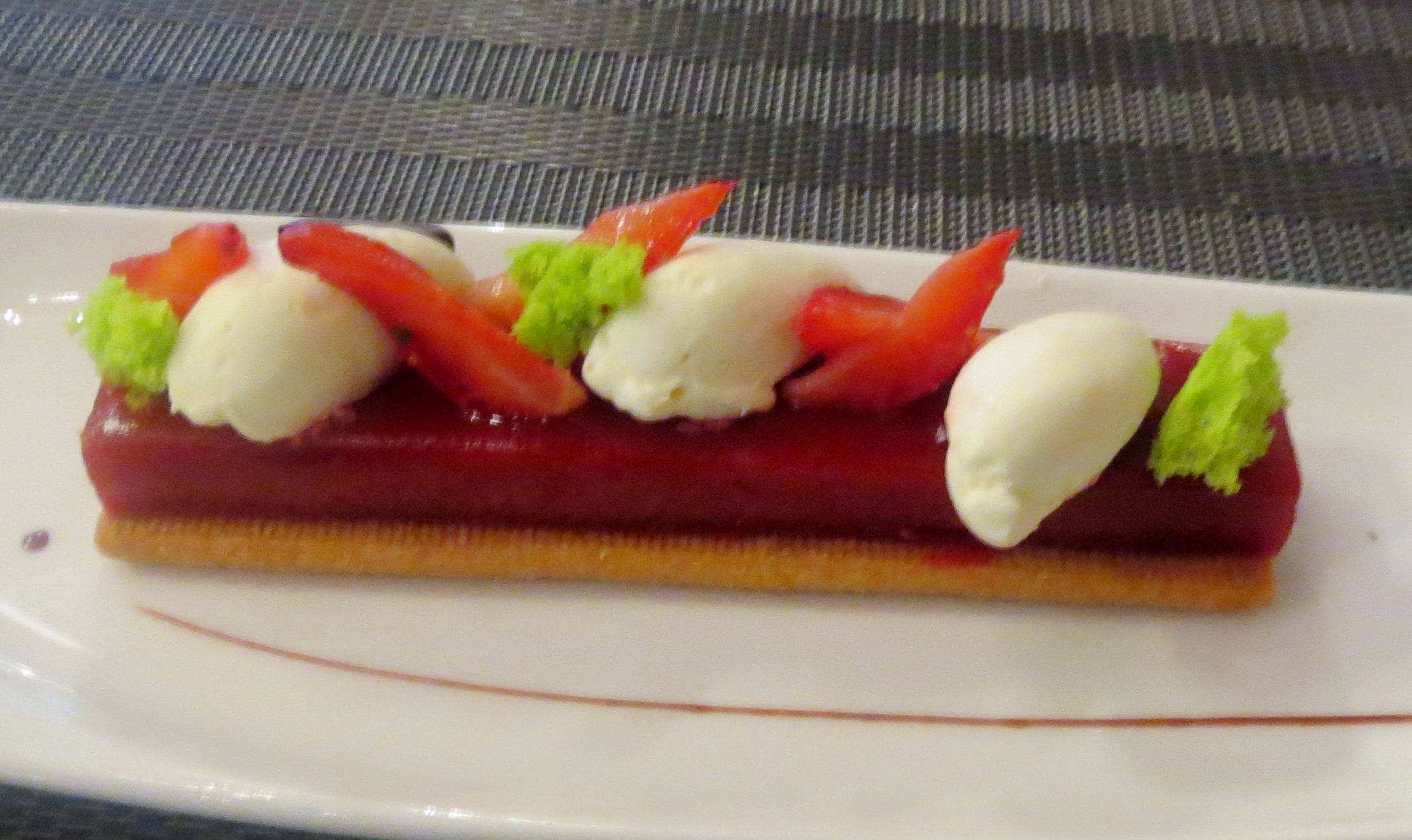 Dinner was a three course marvel. The restaurant’s specialty is the use of chocolate in many recipes. So we had mushrooms with a very subtle chocolate sauce, and lamb shoulder and a kind of Paella with chocolate sauce. The chocolate touches in these dishes were not at all obtrusive. They simply added depth and richness to the palette of flavors. Nancy’s dessert was totally chocolate. Mine was a gluten free (a real rarity in Paris) strawberry tart garnished with squares of dark chocolate – Yummy! It was a wonderful ending to a very enjoyable day, for sure.