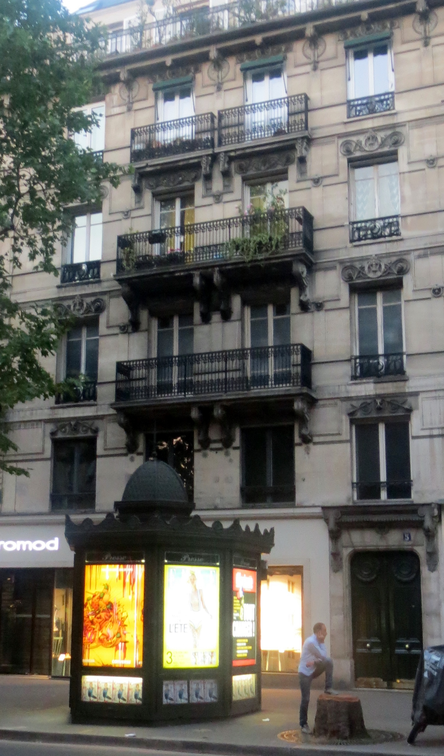 Back on the boulevards, waiting for the bus to take us home — a typical 19th century Paris apartment house.
